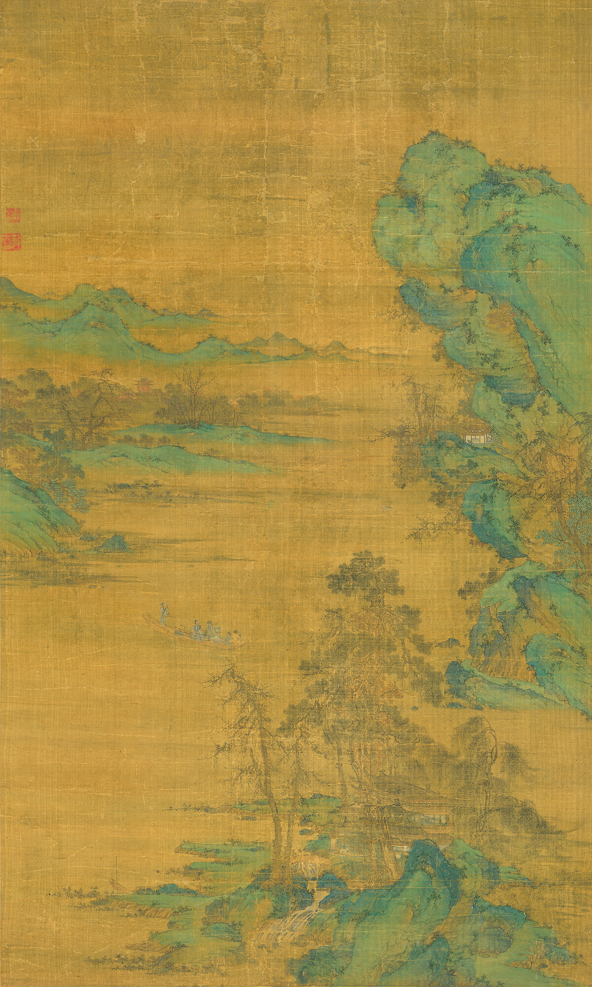 与古人一同踏上这场虚虚实实的山水之旅。明代王绂曾两次随明成祖巡狩北京,《王绂燕京八景图卷》卷各幅标题篆书,按顺序分别为:金台夕照、太液晴波、琼岛春云、玉泉垂虹、居庸叠翠、蓟门烟树、卢沟晓月、西山霁雪;图卷墨色淋漓、构图严谨,艺术水准很高,具有的鲜明写实特征,应是亲自到过八景实地,并摹写自然真景而成此卷,属具有实景元素的作品。被明成祖称赞为“谨厚淳朴,无矫伪”的明初宫廷画家郭纯,擅用“大小李”之法作金碧山水,直宗北宋宏伟风格。《郭纯赤壁泛舟图轴》绘一扁舟泛于江上,舟上有6人,似描绘东坡游赤壁之故事;画中连绵山峦间楼阁掩映,一江两岸式的辽远构图尽显清旷之意。“展览的两个部分可以理解为一个是眼见的山水,一个是心中的山水。一个实景,一个虚景。这个虚景有可能是作者根据一首诗或者心里的景去画的。”罗翔说。