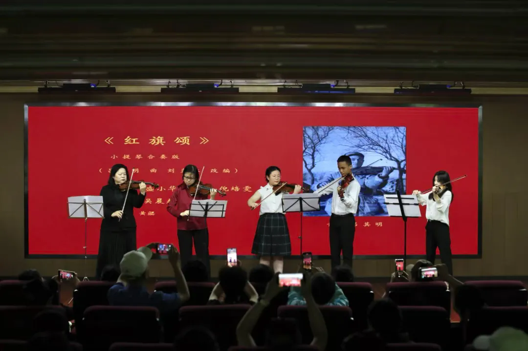 这是一场跨越时空的深情对话。展厅里,贺绿汀手书《游击队歌》静静陈列,一件浸染青春热血的旗袍在无声诉说……在激昂的小提琴合奏《青春进行曲》中,一场历史文物与音乐旋律交织的思政课拉开帷幕。南京艺术学院特聘教授盛小华以琴弦为笔、以音符为墨,带领学生倾情演绎小提琴曲,并分享音乐背后的历史故事与创作历程。活动现场,《松花江上》《嘉陵江上》《战壕里的小提琴》《一件旗袍的追思》《红旗颂》等抗战题材作品以音乐为媒介,以文物故事、历史影像为载体,为大家带来一堂可听、可感、可思的思政课。