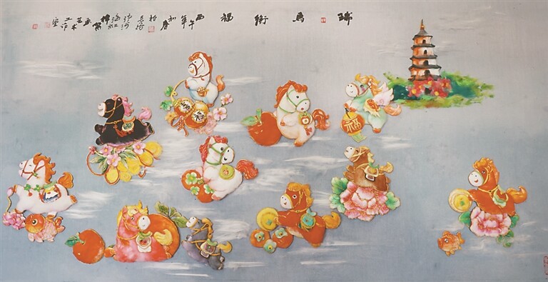 瑞马踏春,衔福而来。画面里的瑞马形象既呼应了马年新春纳福的美好祈愿,也象征着非遗棉絮画在岁月流转中生生不息的生命力。创作中,师徒二人坚守传统堆贴、塑形的工艺精髓,以棉絮为料、以指尖为笔,是对非遗本真的守正之道;同时将生肖文化、新年元素与现代审美巧妙融合,让古老的棉絮画在新时代焕发出全新光彩,这正是非遗活化的创新之法。