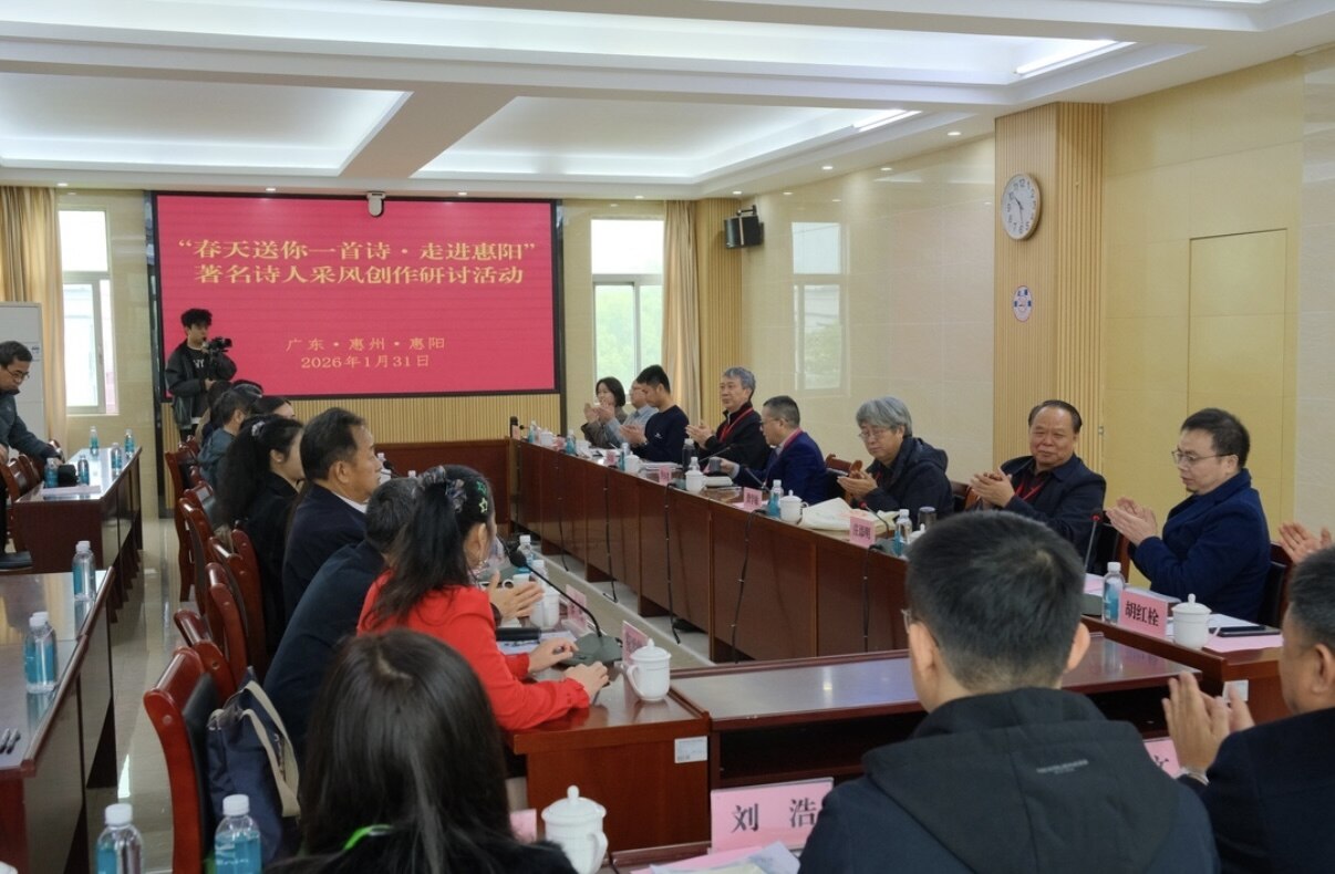 1月31日,由《诗刊》社主办的“春天送你一首诗——走进惠阳”生态诗歌研讨会在广东惠阳举行。《诗刊》社主编李少君,四川省文联副主席龚学敏,广东省惠州市文联党组书记、主席田茂真以及胡伟、胡红拴、庄添明、王江江、李云、方舟、陈希、冯娜、祝雪侠、华海等诗人、专家及有关方面负责人与会研讨。会议由《诗刊》社主编助理、中国诗歌网总编辑金石开主持。