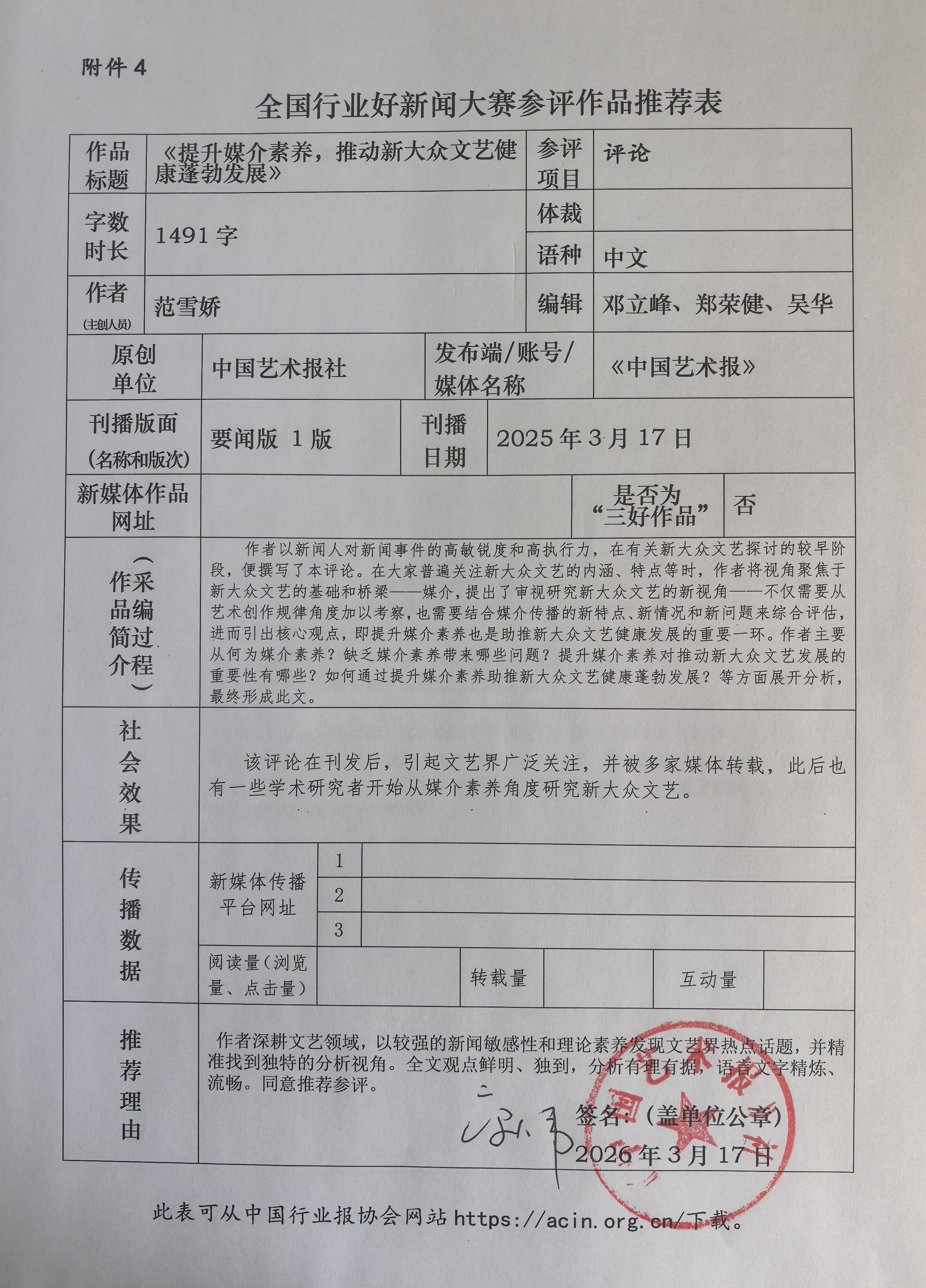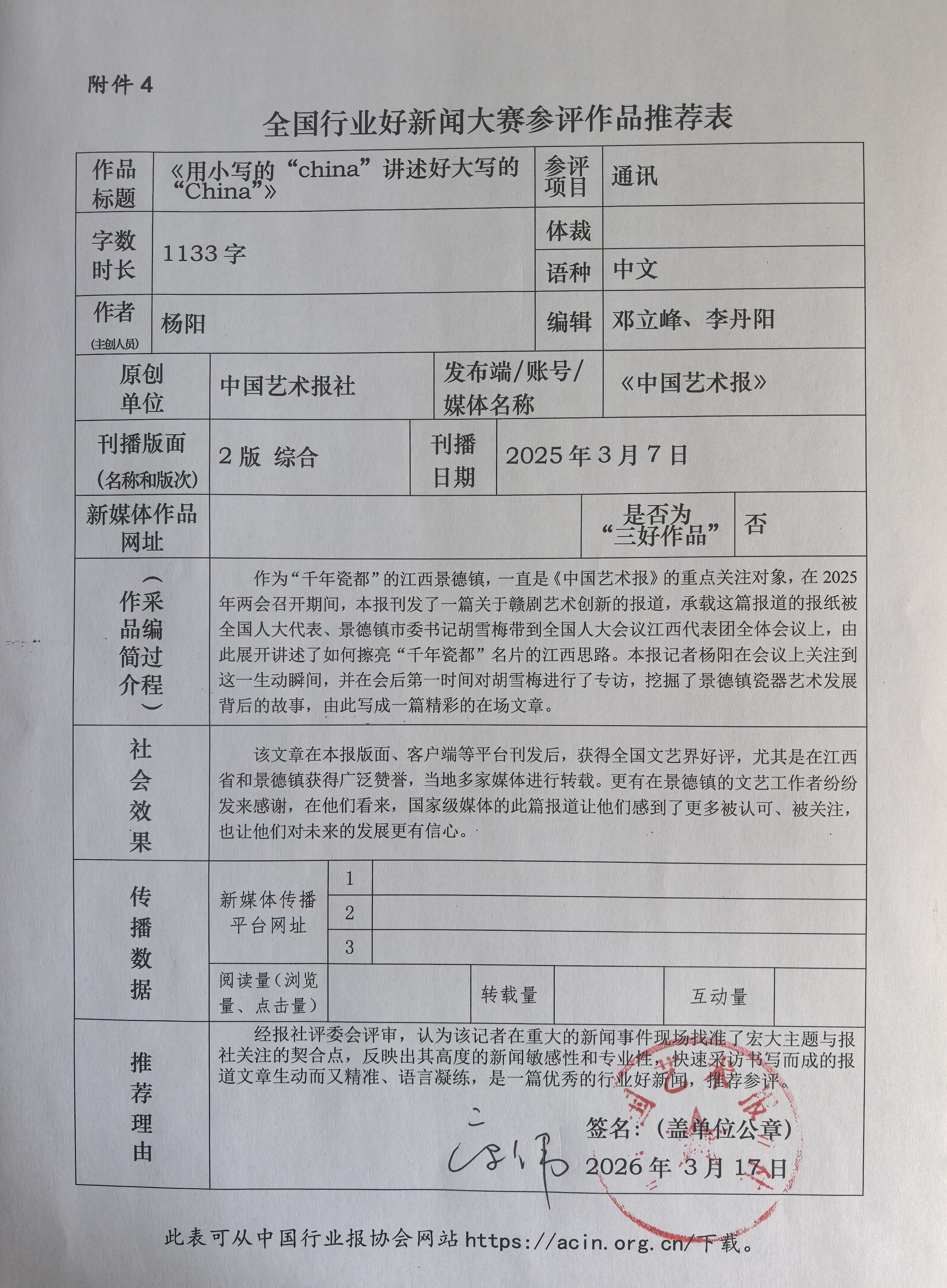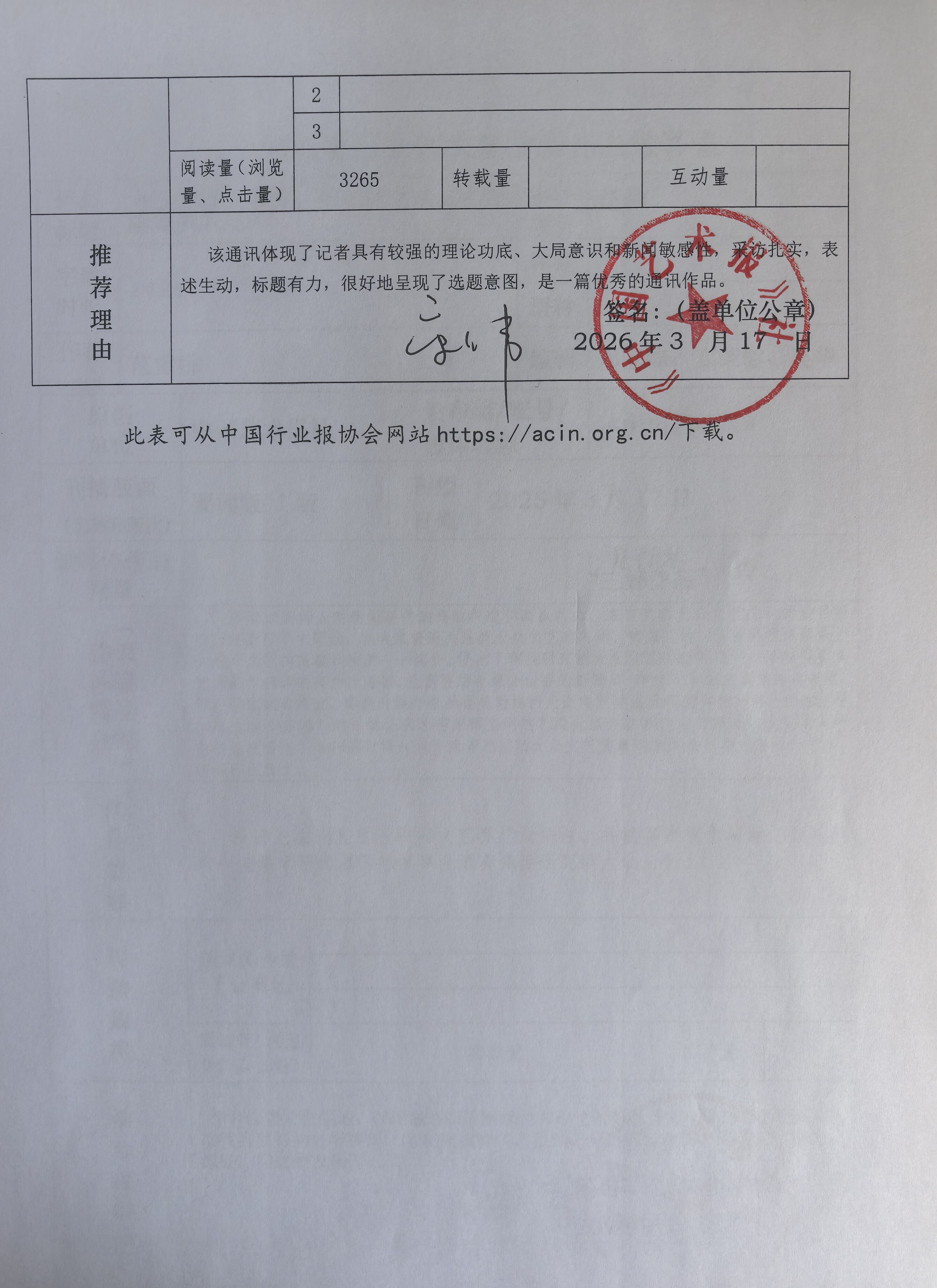 根据中国行业报协会《关于开展全国行业好新闻大赛的通知》要求,现将我社推荐的参评作品公示如下: